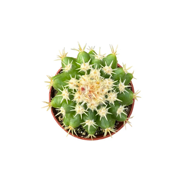 The Short Spined Golden Barrel Cactus (Echinocactus grusonii var. intermedius) is a rare and highly collectible form of the classic Golden Barrel. Unlike the standard variety, this cultivar produces shorter, neater spines that highlight its perfectly rounded, ribbed body and rich golden tones. Native to Mexico, this slow-growing cactus is prized for its striking symmetry and compact look, making it a standout specimen in any collection. Hardy and drought-tolerant, it thrives in bright light and well-draining soil—an ideal choice for cactus enthusiasts and rare plant collectors alike.